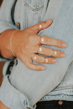 • For midi rings, size down 2-3 sizes for which finger you want it on. Our Teeny Tiny Bands, Tiny Hammered Bands, and Midi Wrap Rings are our most popular for midi rings.