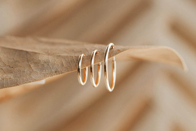 Our Endless Hoops are tube wire hoops available in 3 sizes: 12mm, 14mm, and 16mm. To open the hoop, gently pull the wire post out of the tube. Shift the two ends of the hoop sideways (apart from each other) to fit around your lobe. Then, insert the thinner wire into the front side of your piercing. Once it’s in, gently pull apart to get the wire post back into the tube.